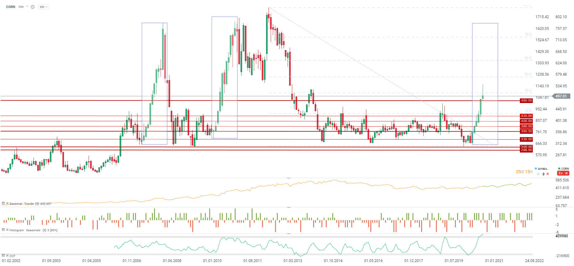 El maíz experimentó la mayor venta en 17 meses el viernes pasado. Curiosamente, es difícil señalar un factor que podría haber desencadenado tal declive. Además, los últimos datos sobre exportaciones agrícolas de Estados Unidos han sido muy buenos. Por otro lado, se elevarán las previsiones para América del Sur. Además, el número de posiciones largas en maíz y soja se ha reducido considerablemente últimamente. Vale la pena señalar que el número de posiciones largas abiertas ha sido extremadamente alto últimamente, el más alto en una docena de años. El maíz cotiza hoy 1.3% a la baja, pero el cierre de la vela mensual es crucial ahora. El precio cayó por debajo del 38,2% de retroceso y el área de 500 centavos. Si vemos una caída por debajo del área de 480 centavos, el escenario bajista puede comenzar a materializarse.