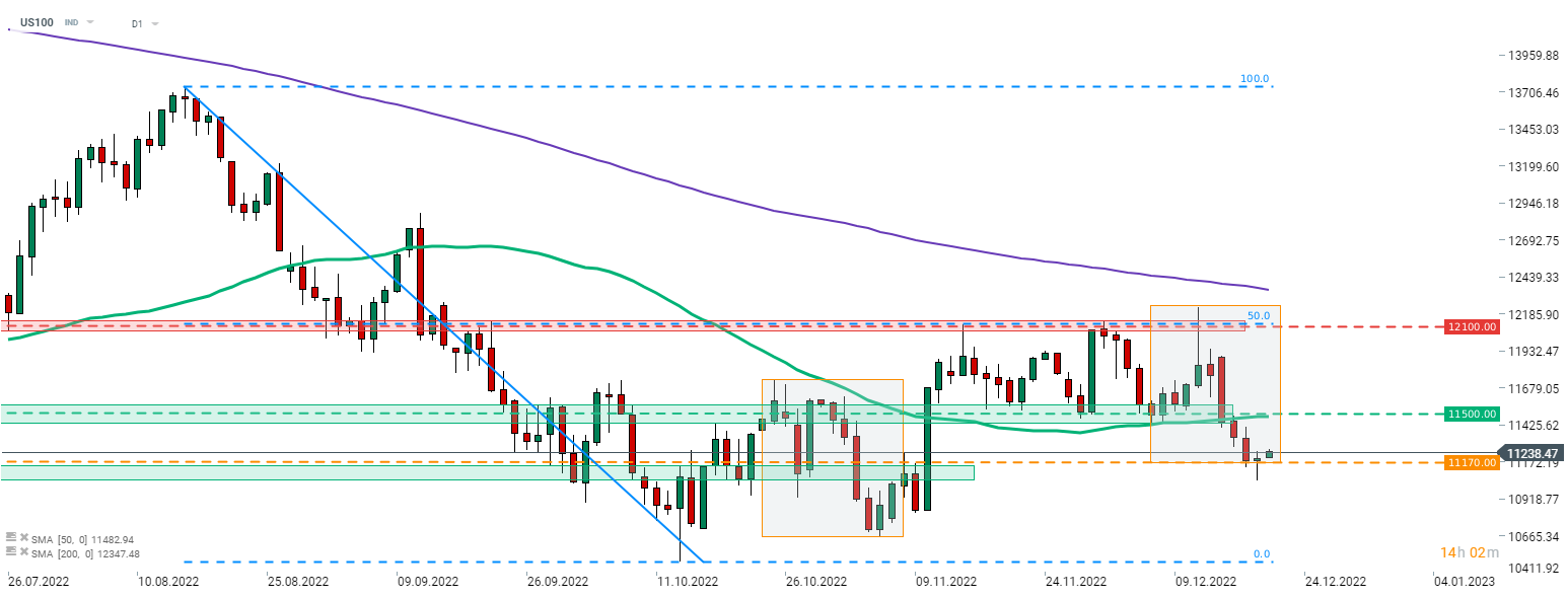 Echando un vistazo al Nasdaq-100 (US100) en el intervalo D1, podemos ver un desarrollo técnico interesante. El índice intentó romper por debajo del límite inferior de una geometría del mercado local ayer, pero los alcistas finalmente lograron defender el área de 11,170 pts. Esto significa que la tendencia alcista a corto plazo todavía está en juego y una mecha larga y más baja de la vela diaria de ayer impulsa aún más la perspectiva para los alcistas. Si el movimiento de recuperación en curso se extiende, la primera resistencia a corto plazo a observar es el área de 11,500 pts, que sirvió como el límite inferior de un rango de cotización roto anteriormente (11,500 - 12,100 pts).