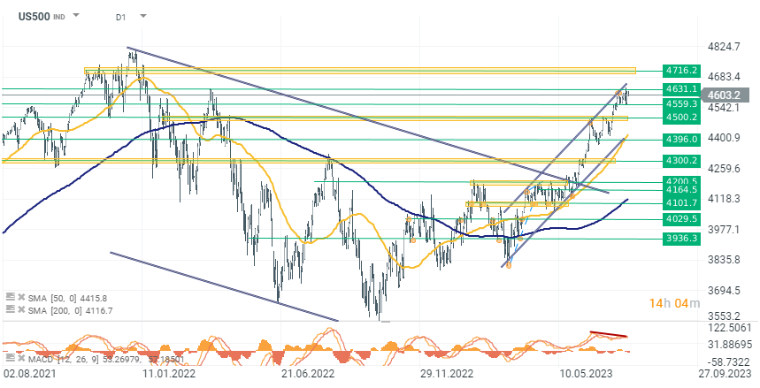 El S&P 500 (US500) alcanzó recientemente un nivel de resistencia crítico en 4.631, lo que genera dudas sobre los próximos movimientos del mercado. La semana pasada, la Reserva Federal implementó un aumento de la tasa de interés de 25 pb ampliamente anticipado, y los participantes del mercado siguieron de cerca la conferencia de prensa del presidente de la Fed, Powell, en busca de pistas sobre futuras decisiones políticas. Sin embargo, Powell no ofreció señales claras y enfatizó la confianza de la Fed en los datos para futuras elecciones. Los datos económicos posteriores a la reunión del FOMC apuntaban a un escenario de aterrizaje suave, con las solicitudes de desempleo de EE. UU. superando las expectativas, pero el PCE de EE. UU. y el índice de costos de empleo por debajo de las previsiones.