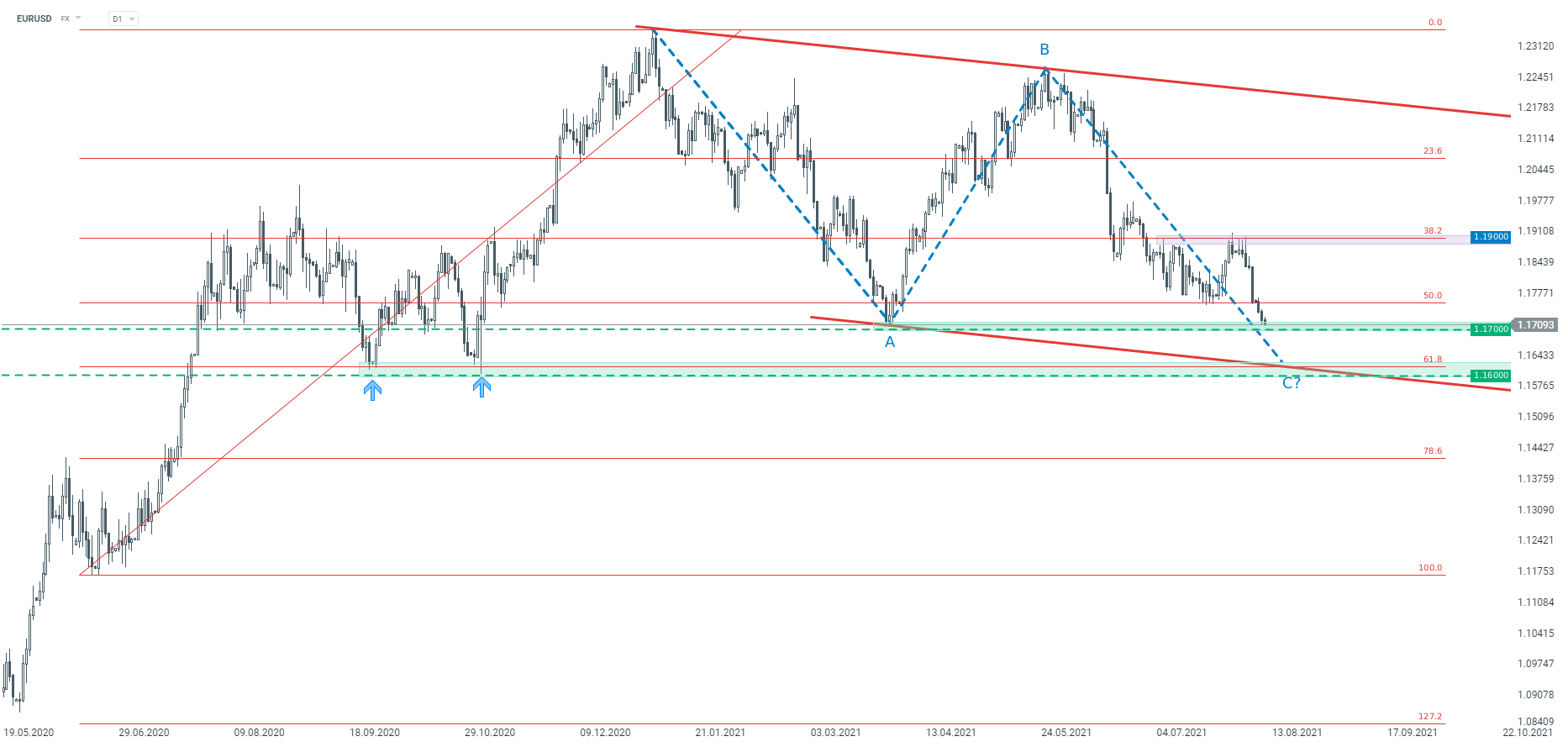 Por último, pero no menos importante, veamos el gráfico EURUSD. El par de divisas principal ha estado cotizando a la baja recientemente. Sin embargo, en una visión a largo plazo (concretamente, desde marzo de 2020), todavía se puede hablar de una tendencia alcista, y el reciente movimiento a la baja puede ser la corrección del patrón técnico ABC (gráfico posterior). Si asumimos tal escenario, el par no puede romper el soporte en 1.1600, que es el resultado de los mínimos de septiembre y noviembre de 2020. Este soporte también está marcado con el nivel 61.8% retroceso de Fibonacci del reciente movimiento alcista, así como el patrón técnico 1:1. Sin embargo, en caso de una caída por debajo de dicha zona, el movimiento a la baja puede acelerarse.
