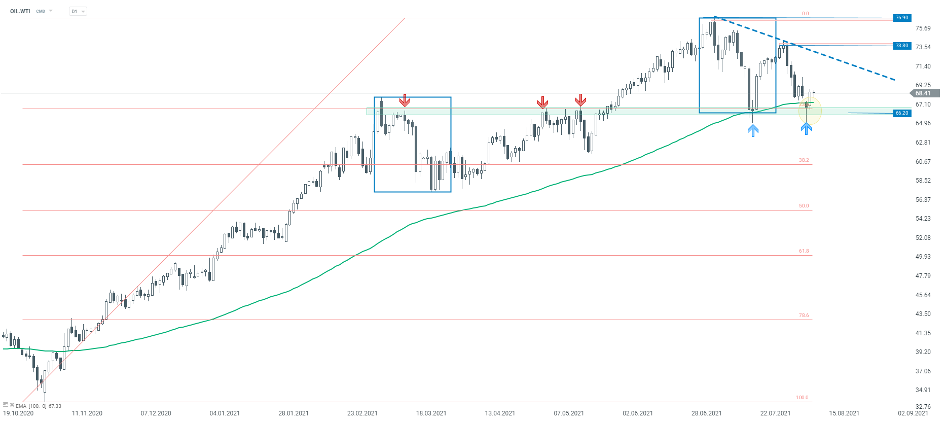 A continuación, echemos un vistazo al mercado del petróleo. Al analizar el gráfico en el intervalo D1, se puede ver que la reciente corrección a la baja se detuvo en el área de soporte clave. La zona marcada con color verde en el gráfico a continuación es el resultado del límite inferior de la estructura 1:1, el nivel 38,2% del retroceso de Fibonacci y el límite inferior del canal ascendente. Esta área fue probada en julio por primera vez, y de nuevo el lunes. Los compradores parecen estar en ventaja por ahora. Según el análisis técnico clásico, el rebote en esta zona de soporte confirma el sentimiento alcista a medio plazo, y la continuación de la tendencia alcista parece ser el escenario base. La resistencia más cercana a observar se encuentra en 73,80 USD. También se debe prestar atención a la línea de tendencia bajista local.