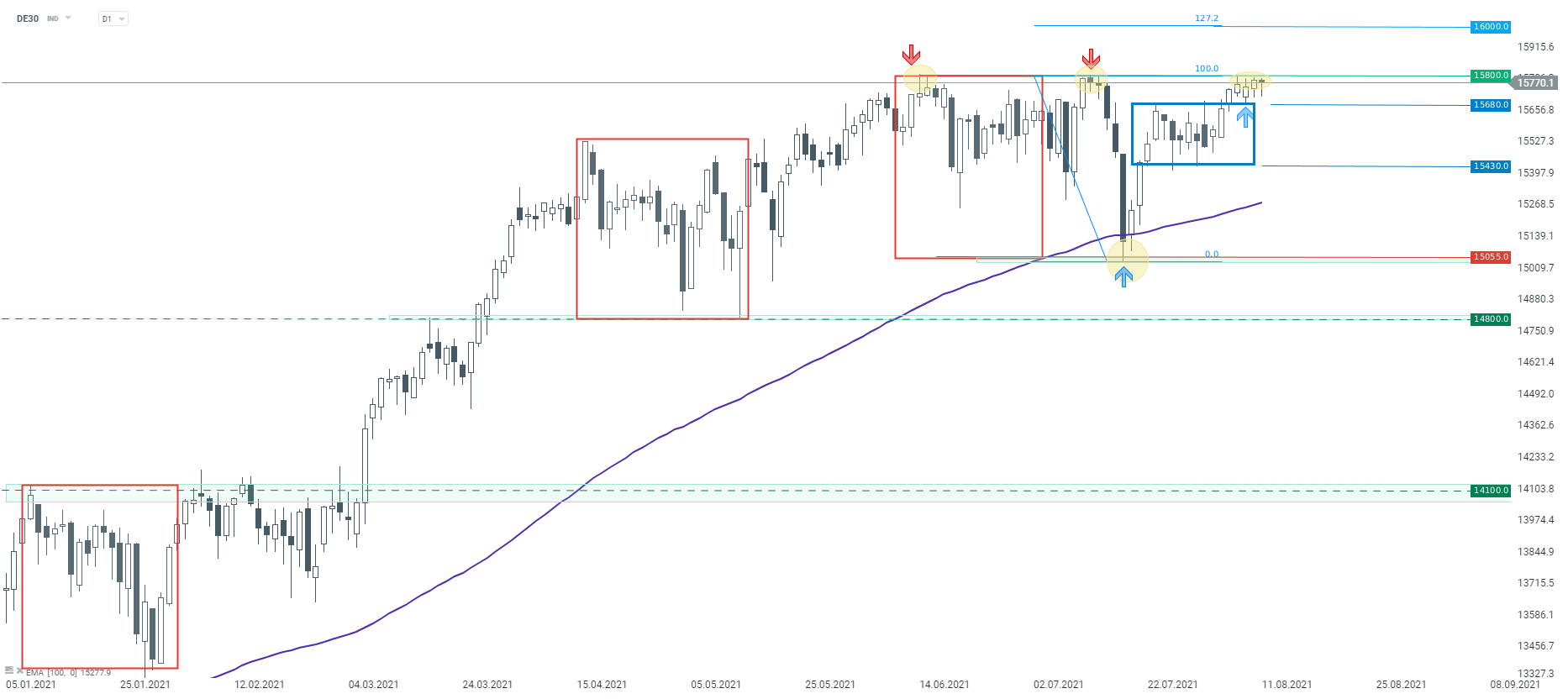 Comencemos el análisis de hoy con el índice alemán: DAX (DE30). Al observar el gráfico en intervalo diario, se puede ver que el precio ha superado el rango de negociación local, que está marcado con el cuadro azul del gráfico posterior. A pesar de romperse el rango de consolidación, el impulso alcista se desaceleró, no logrando los compradores romper en nuevos máximos históricos cerca de los 15,800 puntos. Sin embargo, el sentimiento a largo plazo sigue siendo alcista, y la continuación de dicho movimiento alcista parece posible. En tal escenario, el nivel 127.2% del retroceso de Fibonacci es el próximo objetivo para los compradores; ahí es donde se localiza el rango de consolidación.