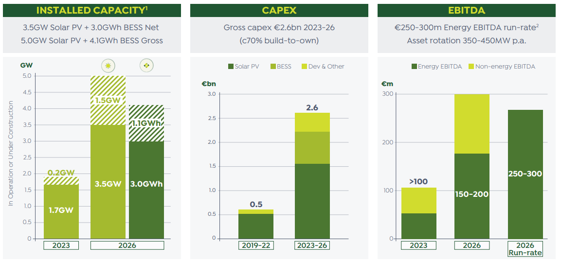 La empresa tiene la intención de invertir 2.600 millones de euros hasta el 2026, centrándose principalmente en su cartera de proyectos fotovoltaicos en los que invertirá 1.500 millones de euros. Es importante señalar el gran aumento del capex en su nuevo plan estratégico, puesto que la cantidad destinada es 5 veces mayor a la del anterior plan. Por otro lado, pretenden alcanzar un EBITDA de entre 250 y 300 millones de euros para el año 2026, lo que supondría crecer alrededor de más de un 35% anualizado desde las cifras actuales.