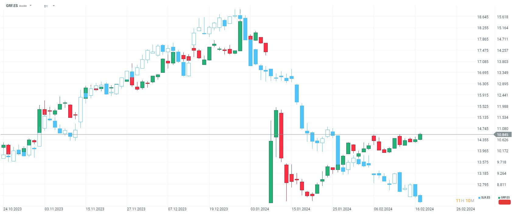 Las velas verdes y rojas representan el precio de las acciones de Grifols mientras que las blancas y azules representan el precio de las acciones de Solaria. Fuente: Plataforma de XTB.