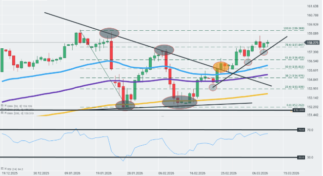 El par USD/JPY continúa su tendencia alcista antes de la lectura de inflación de EE. UU. y sigue defendiendo la zona clave de soporte marcada por el límite inferior del canal alcista iniciado a finales de febrero y la EMA de 50 días. Un crecimiento de precios más fuerte en EE. UU. podría teóricamente impulsar al par aún más arriba, hacia los 159,37 yenes, donde se encuentran los máximos del año. Por el contrario, cualquier caída podría llevarle de vuelta a los niveles de soporte técnico mencionados.
