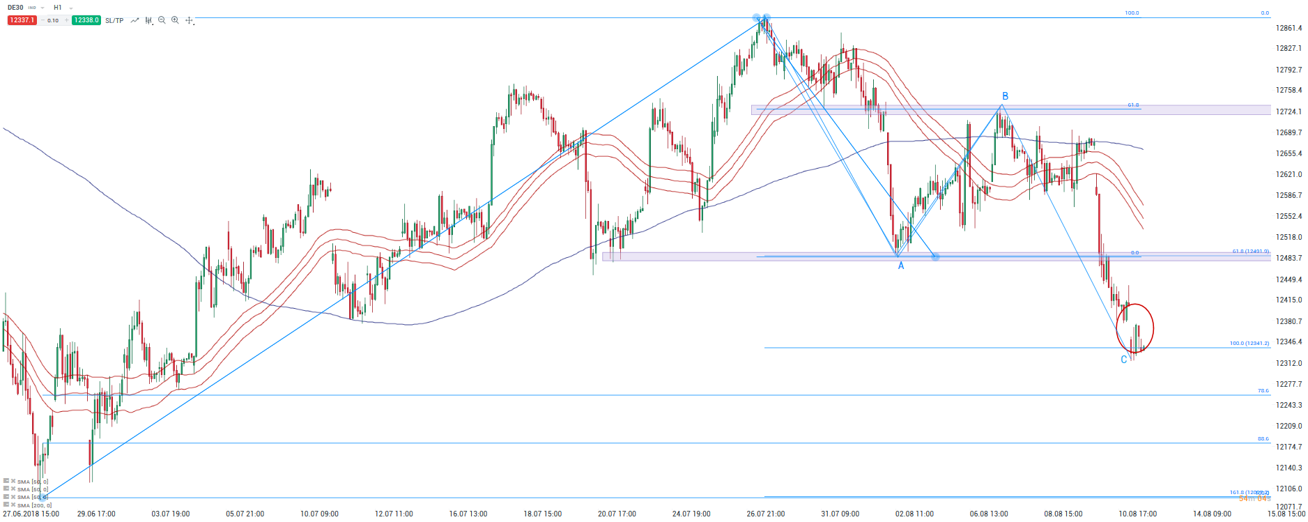 Bajando a un timeframe horario podemos observar una movimiento correctivo sobre las últimas subidas en forma de A-B-C, con una igualdad de ondas entre la primera y la tercera (A=C). Tras haber completado media sesión consolidando los niveles cercanos a 12.350 puntos se nos plantea la oportunidad de buscar un posible punto de giro que ponga fin a las caídas que estamos viendo, al menos de forma momentánea.