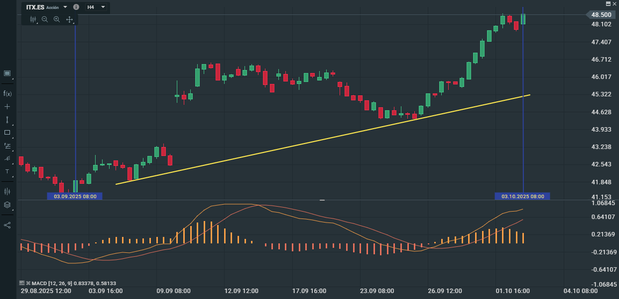Como podemos ver en la gráfica a continuación, el indicador técnico MACD se sitúa en posición de compra para Inditex.