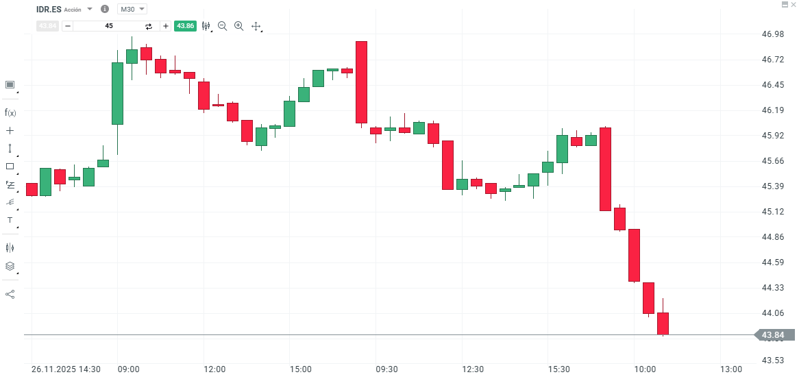 En este escenario de incertidumbre, las acciones de Indra corrigen un 4,6% intradía, mientras que en el conjunto del 2025 la cotizada del sector defensa se apunta un ascenso bursátil del 148%.