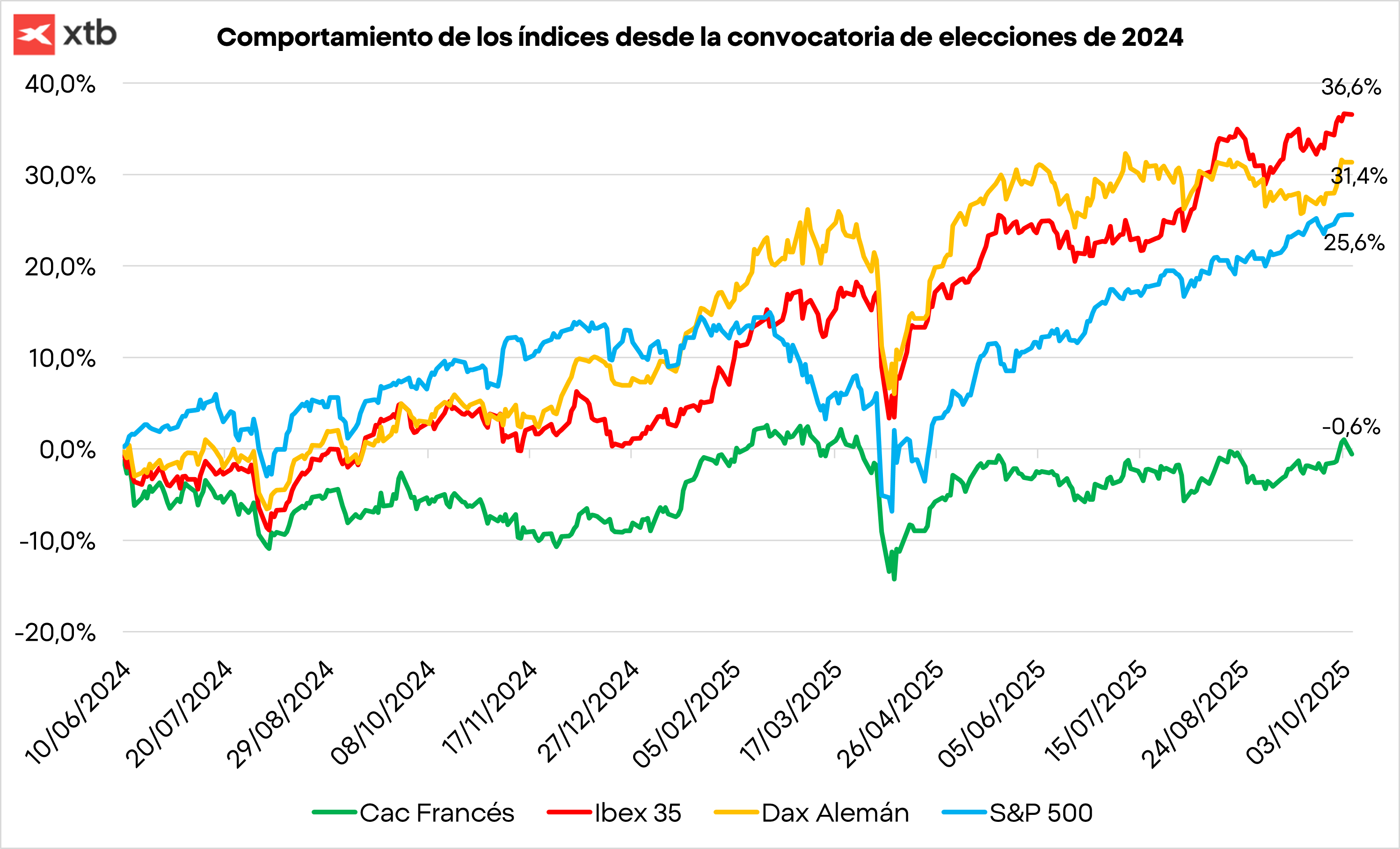 Pero el comportamiento negativo del índice francés en la sesión de hoy no es algo puntual. De hecho, desde la convocatoria de elecciones anticipadas de Macron en junio de 2024, el Cac francés cotiza en negativo con una caída acumulada del 0,6%. Podemos ver la gran diferencia que hay con otros índice europeos como el Ibex 35 o el Dax Alemán que suben en el mismo periodo de tiempo un 36,6% y un 31,4% respectivamente.
