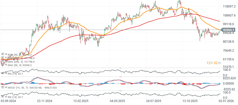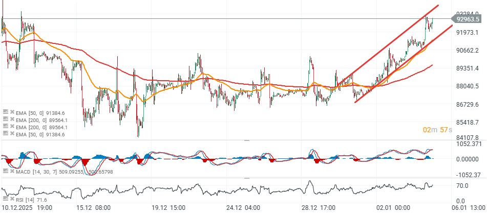 Tanto el Bitcoin como el Ethereum se negocian dentro de un canal de precios ascendente, y en el gráfico horario podemos observar el surgimiento de una formación de platillo potencialmente alcista. Para Bitcoin, el soporte clave se encuentra actualmente alrededor de los 91.800 dólares, donde se encuentra el límite inferior del canal de precios y la EMA50.