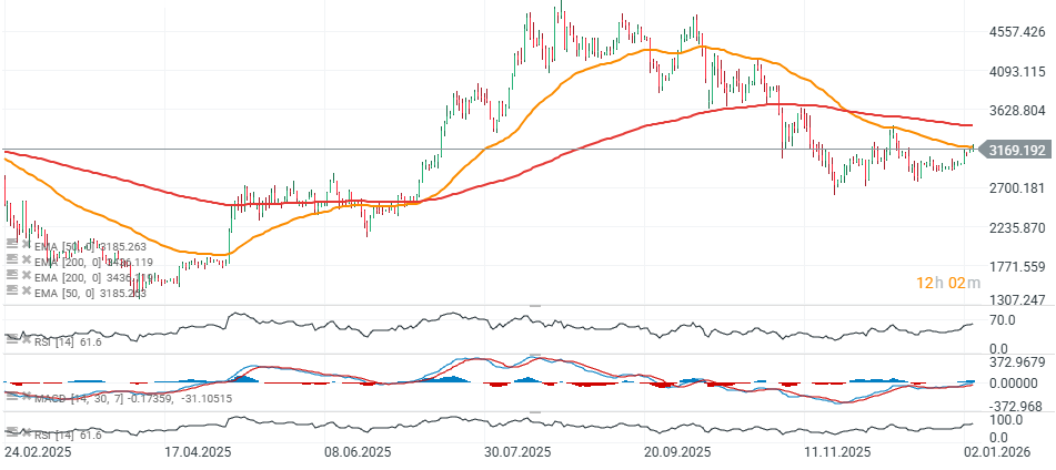 Al igual que Bitcoin, Ethereum también está subiendo hoy a niveles no vistos desde mediados de diciembre. El soporte clave a corto plazo lo indica la EMA50 en el gráfico horario (alrededor de 3.100 dólares), mientras que el límite inferior del canal se sitúa alrededor de 3.050 dólares, donde también se encuentra la EMA200 (línea roja).