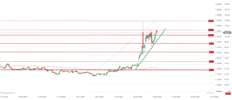 Los precios del oro reaccionaron positivamente a los informes sobre el deseo de Trump de una resolución rápida del conflicto. Jerome Powell (Fed) afirmó en su discurso que es difícil evaluar el impacto que la situación actual tendrá en la economía y en la inflación a largo plazo. Sin embargo, la Reserva Federal considera que está en una “buena posición”. El mercado descuenta actualmente menos de una subida completa de tipos, mientras que antes de la guerra se esperaban 1–2 recortes.