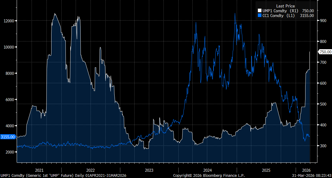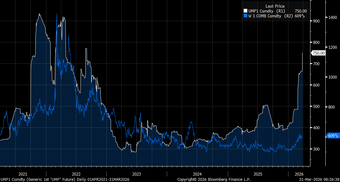 Los precios de la urea (un fertilizante universal) están subiendo con fuerza en todo el mundo, recordando la situación de 2021 y 2022. Oriente Medio es un productor clave de este fertilizante; las escaseces podrían aumentar los costes agrícolas y reducir las cosechas si se restringe su uso. Las entregas de fertilizantes son críticas en el hemisferio norte tras el invierno, justo antes de la siembra de los principales cultivos.