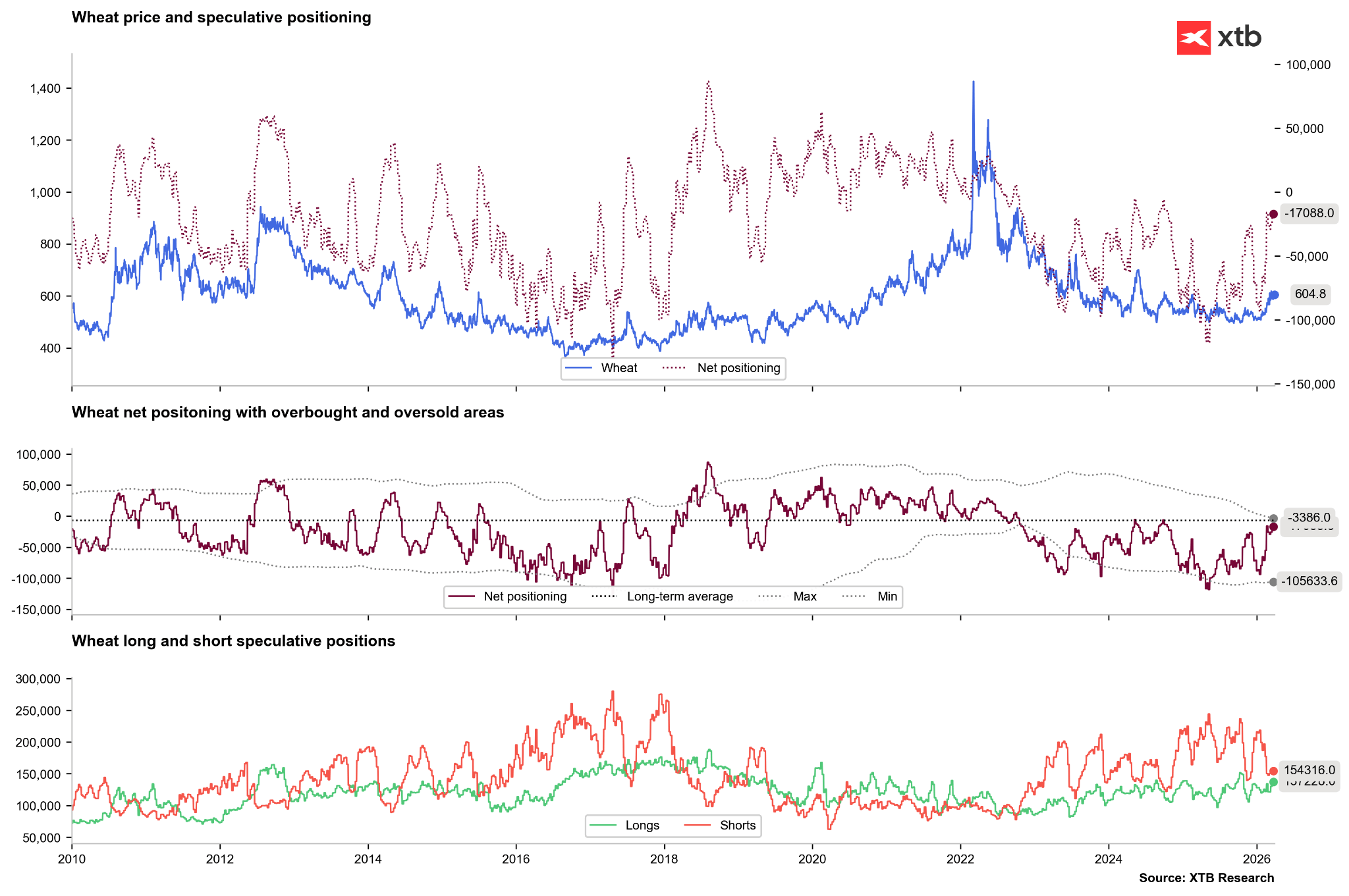 Los precios del trigo han vuelto por encima de 600 centavos por bushel. Las posiciones netas están en su nivel más alto desde mayo y octubre de 2024. Al mismo tiempo, las posiciones netas entre especuladores siguen siendo negativas. La última vez que fueron positivas fue en 2022 durante la crisis de suministro tras el inicio de la guerra en Ucrania.