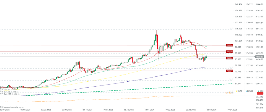 El oro intenta romper por encima de 4500 USD por onza, pero las ganancias podrían verse limitadas por la media móvil de 100 periodos. Aunque el fin del conflicto podría llevar rápidamente a un test de la zona de 5000 USD, el precio sigue vulnerable a un test del rango 4200–4400 USD si surgen nuevas señales de repunte inflacionario. Fuente: xStation5.