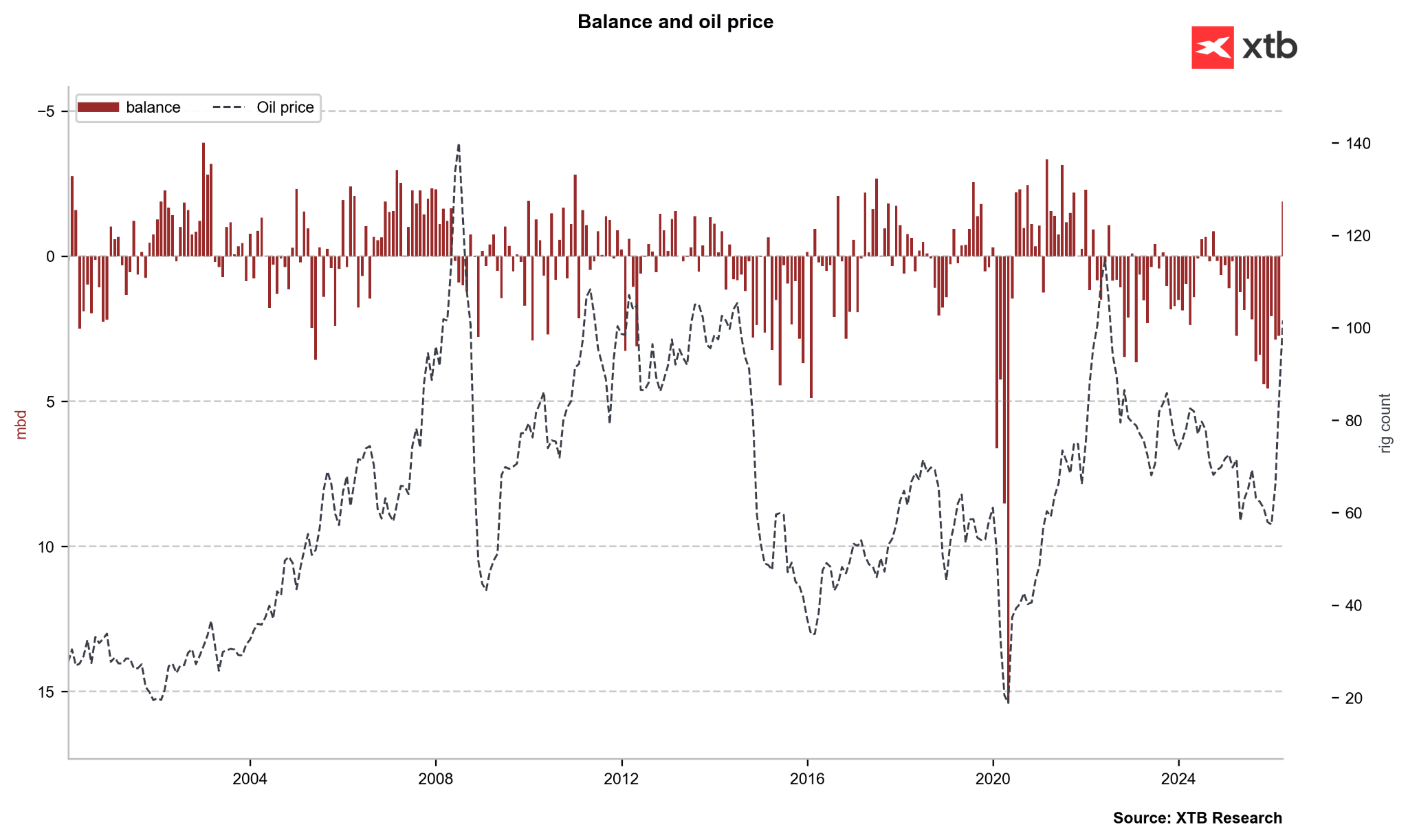 Las estimaciones iniciales indican que el déficit en marzo promediará alrededor de 2 millones de barriles por día (mb/d). Teóricamente, esta cifra podría ser 2–4 veces mayor en abril, considerando los cierres de producción en países del Golfo y la suspensión continua del flujo a través del estrecho de Ormuz. Fuente: Bloomberg Finance LP, XTB.B.