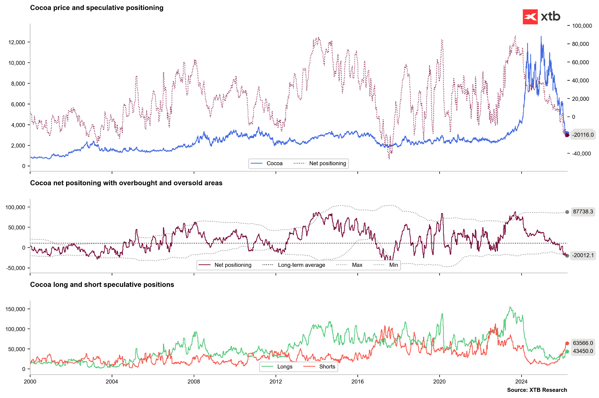 Las posiciones cortas se han reducido claramente, mientras que las largas han rebotado mínimamente. La situación actual comienza a parecerse al periodo 2016–2018, aunque los precios eran mucho más bajos entonces. Fuente: Bloomberg Finance LP, XTB.