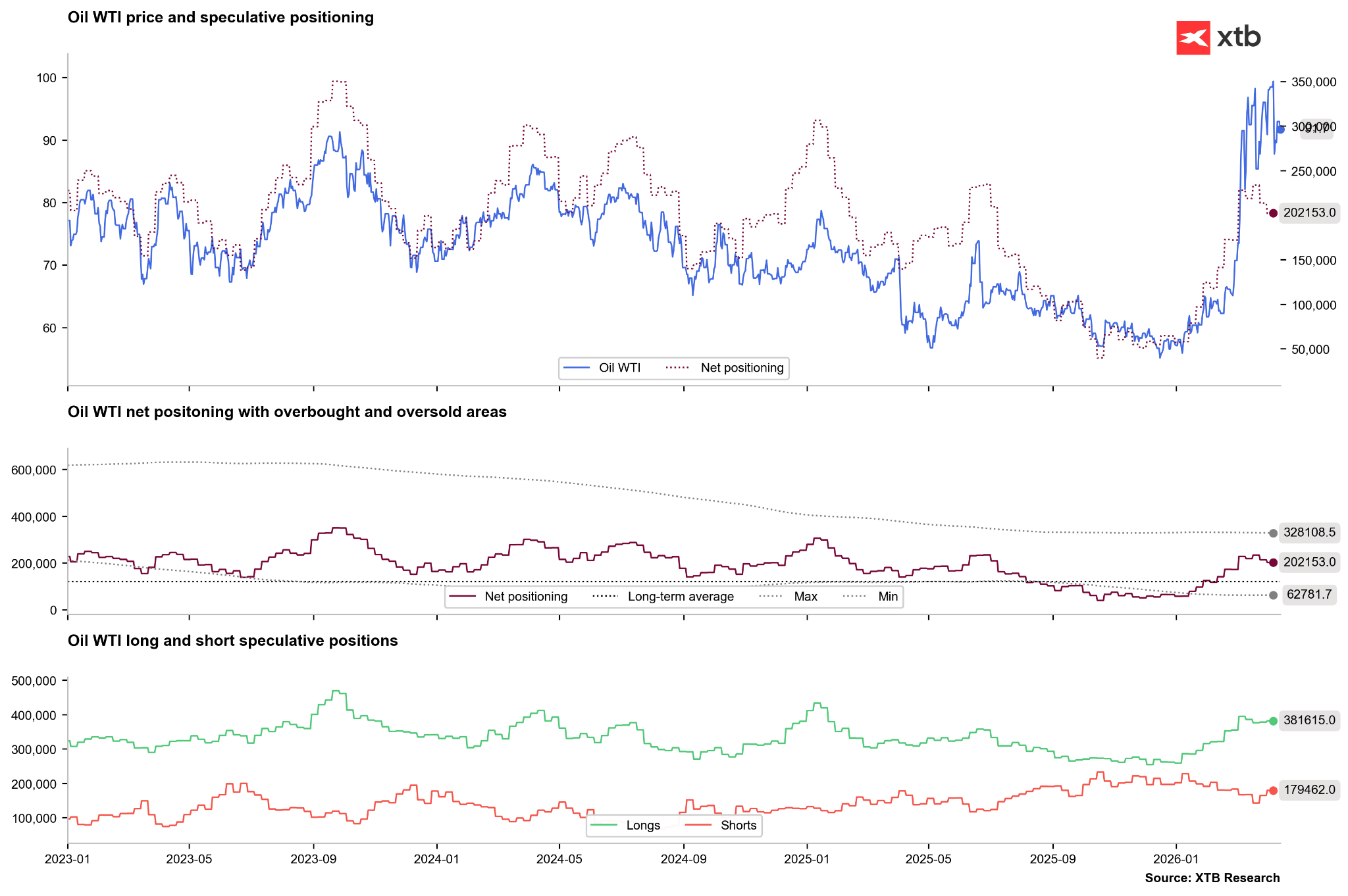 Seguimos observando un short‑covering agresivo entre los inversores no comerciales. El volumen de posiciones cortas ha caído a niveles mínimos de principios de 2026. Por el contrario, las posiciones largas han igualado su pico de principios de 2026. El posicionamiento neto sigue siendo inferior al de 2024 y 2022, cuando los precios cotizaban cerca de 150 centavos en medio de altos precios del petróleo. Por ahora, estamos viendo expectativas de deterioro de los fundamentales más que un cambio real. Una reducción de posiciones largas podría señalar una reversión, aunque los niveles de precios siguen siendo relativamente bajos. Fuente: Bloomberg Finance LP, XTB