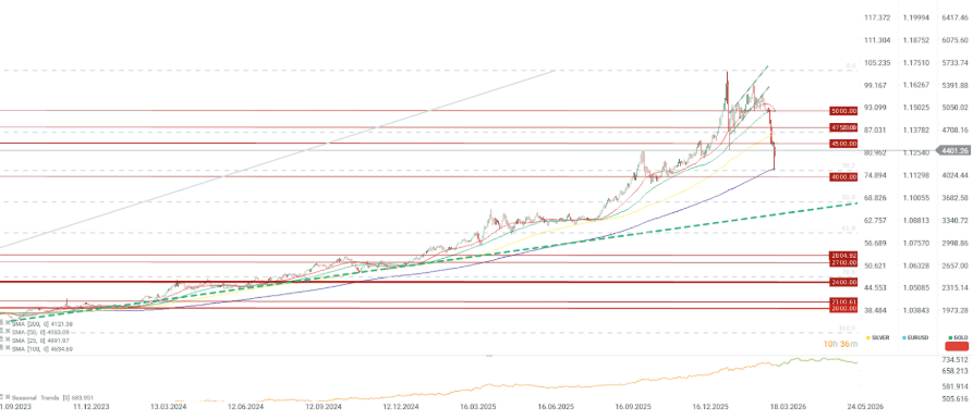 El oro mantiene soporte en la media móvil de 200 periodos y en el retroceso de Fibonacci del 38,2% del rally iniciado a finales de 2022. La resistencia clave está ahora cerca de la media de 100 periodos en 4.750 dólares. Si la caída continúa, el soporte principal se sitúa en el retroceso del 50,0% en 3.600 dólares. Fuente: xStation5