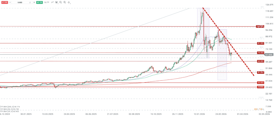 A diferencia del oro, la plata ha perforado el retroceso del 50% de Fibonacci y ahora está poniendo a prueba el nivel crítico del 61,8%. Mantener esta zona es fundamental para preservar una perspectiva alcista a largo plazo. Una ruptura por debajo de los 60 dólares y del 61,8% podría abrir la puerta a un movimiento hacia la franja de 47–50 dólares.