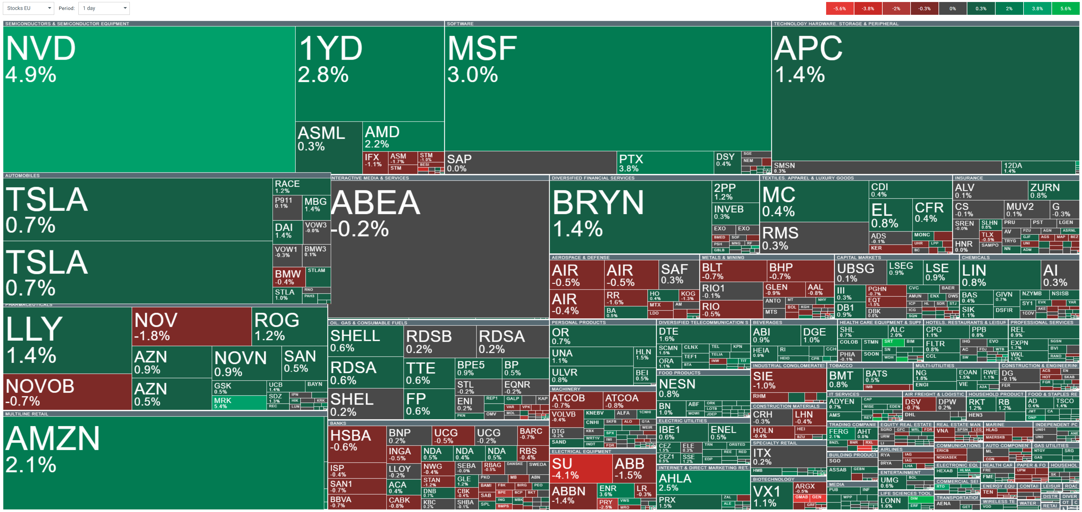 Los mercados europeos muestran tendencias diversas, con la mayoría de los índices en cotizaciones mixtas. El Wig 20 lidera las subidas (+0,88%), mientras que el FTSE 100 cotiza practicamente plano (+0,04%). Por otro lado, varios índices importantes están cayendo, entre los que destaca el Eurostoxx 50 (-0,44%), el CAC 40 (-0,40%), el FTSE MIB (-0,39%) y el Dax 40 (-0,23%). El sentimiento general es cauteloso, con una continua incertidumbre en el mercado.
