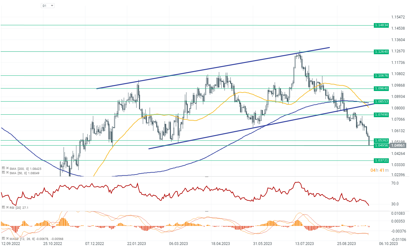 Durante varios días, los mercados han presenciado una huida de activos de riesgo, caídas en los índices y un aumento en el valor del dólar. Hoy trae un fortalecimiento aún mayor. Actualmente, el par EUR/USD está luchando por mantener el nivel 1.05. Sin embargo, dada la tendencia en las últimas semanas, parece inminente una ruptura a la baja. El indicador RSI muestra una sobreventa significativa, mientras que el MACD permanece en una zona que indica una tendencia a la baja. Sin embargo, se puede discernir una divergencia en este indicador, lo que sugiere un debilitamiento del impulso.