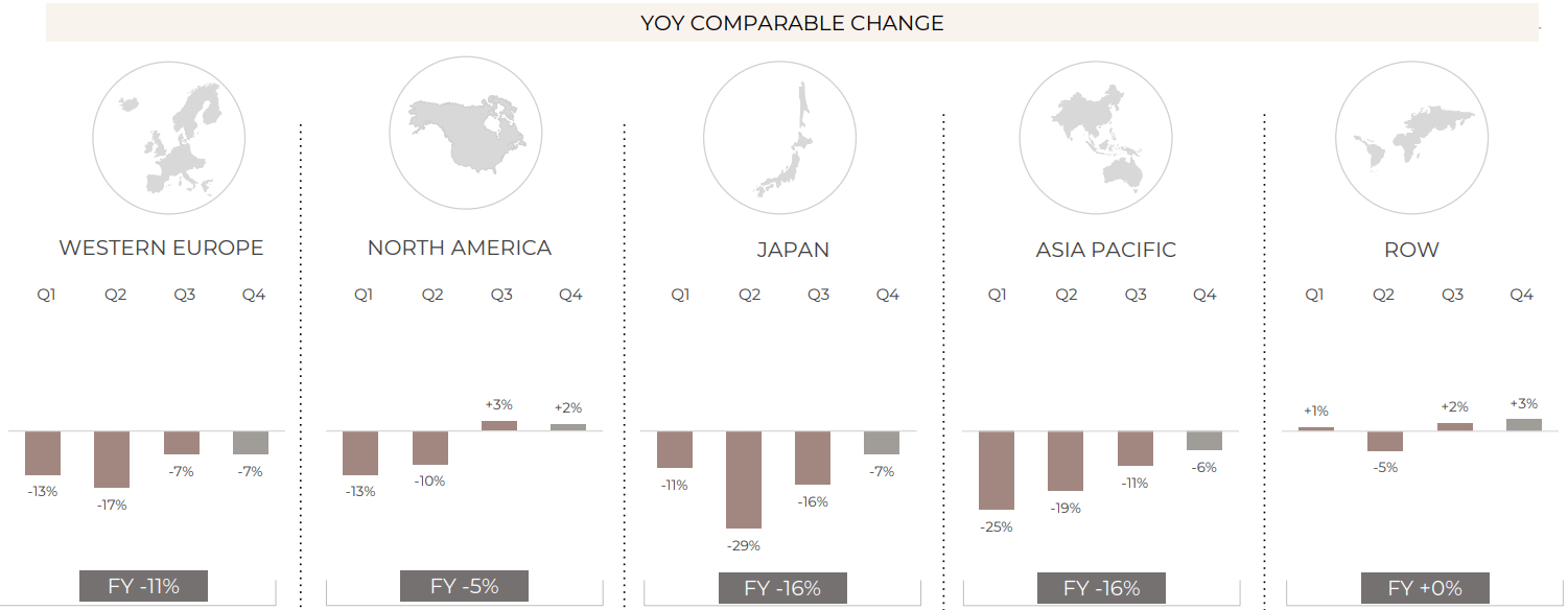 Por canal de venta, se aprecia una clara mejora en la tendencia de las tiendas propias, con una caída de los ingresos en el cuarto trimestre de 2025 del -4%, mientras que se empezaba el año con un descenso del -16% interanual. Incluso por países de ve mejoría, con Asia-Pacífico tan solo cayendo un -6% en el último trimestre a pesar de que China sigue mostrando debilidad para otros sectores e incluso vemos cierta tendencia de los consumidores a enfocarse en marcas asiáticas.