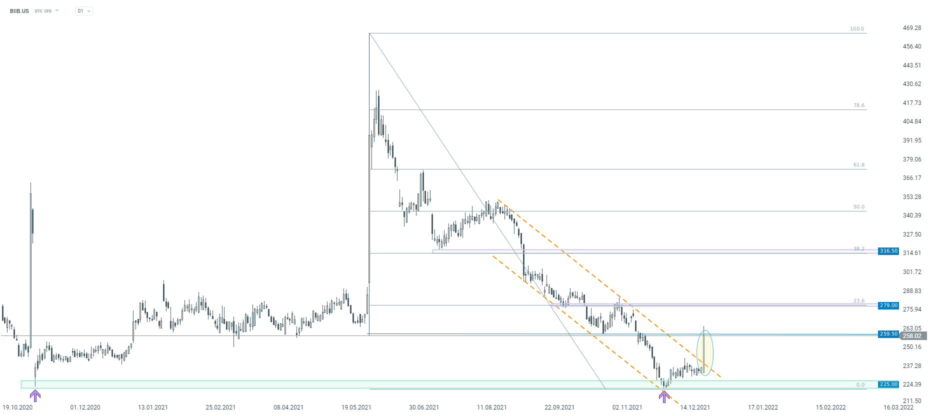 Biogen ha cotizado en tendencia bajista desde julio de este año. A principios de dicho mes, registró un rally gracias a la aprobación por parte de la FDA de su fármaco contra el Alzheimer. No obstante, su lenta implementación, así como el elevado coste del tratamiento, hicieron a los inversores replantearse sus expectativas, cayendo el precio de los títulos poco después. El fuerte rally de ayer permitió escalar dicho precio en dirección al extremo superior del canal bajista, si bien este impulso fue detenido en 259.50 USD. Actualmente, en preapertura se vaticina caída hacia los 242 USD a la apertura de Wall Street (aún por encima del extremo superior de dicho intervalo). El soporte más cercano a vigilar se halla en los 225 USD.
