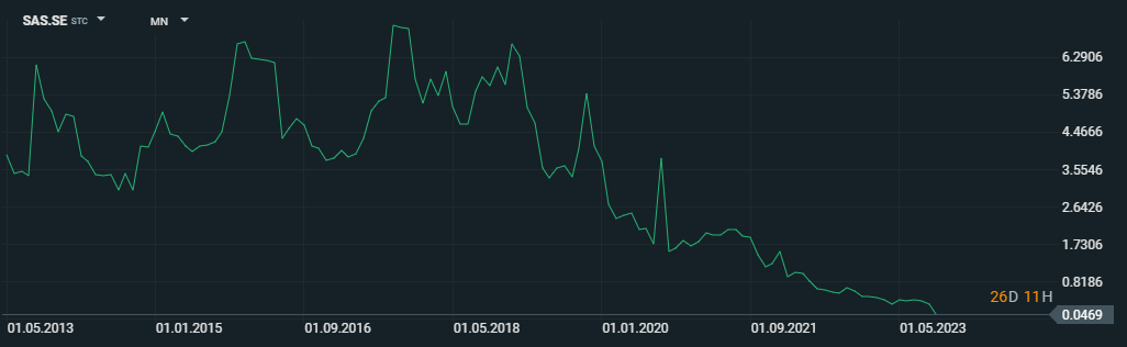 SAS ya llevaba 3 años consecutivos acumulando pérdidas y este 2023 no estaba siendo una excepción. La empresa ya estaba viendo como sus beneficios disminuían y el covid hizo que la empresa entrara en terreno negativo, perdiendo 9.275 millones de coronas suecas en 2020, 6.523 millones en 2021 y 7.048 millones en 2022. Pero no solo son los beneficios, puesto que la compañía ya registró un flujo de caja libre negativo en el 2019 y que ha arrastrado hasta el día de hoy.