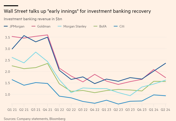 Los cinco bancos de inversión más grandes (Goldman Sachs, JPMorgan Chase, Morgan Stanley, Bank of America y Citigroup) publicaron en conjunto comisiones en este área de 8.200 millones de dólares en el segundo trimestre, un aumento del 40% respecto al año anterior y el más alto desde principios de 2022. Además, todos los bancos, excepto Goldman, anunciaron ingresos de banca de inversión mayores a los esperados para el trimestre.