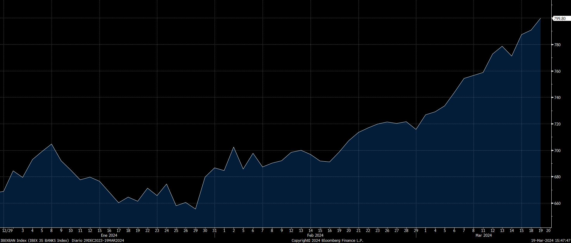 El Ibex 35 Banks recoge la evolución de los bancos que forman el Ibex 35. Este índice ha subido un 19,5% en lo que va de año, lo que refleja el buen comportamiento del sector en general. Fuente: Bloomberg.