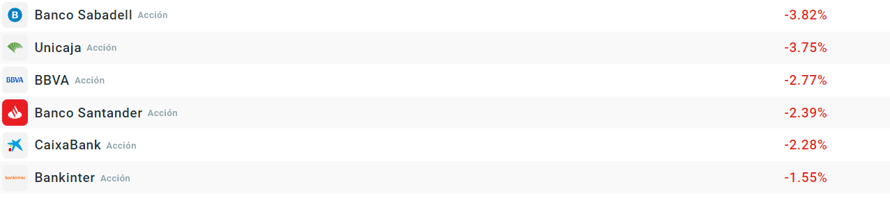 Estos factores están pesando en la cotización de la banca española, donde vemos caídas pronunciadas. La que peor lo hace es Banco de Sabadell, pero incluso la que menos cae, Bankinter, lo está haciendo mal en la sesión.