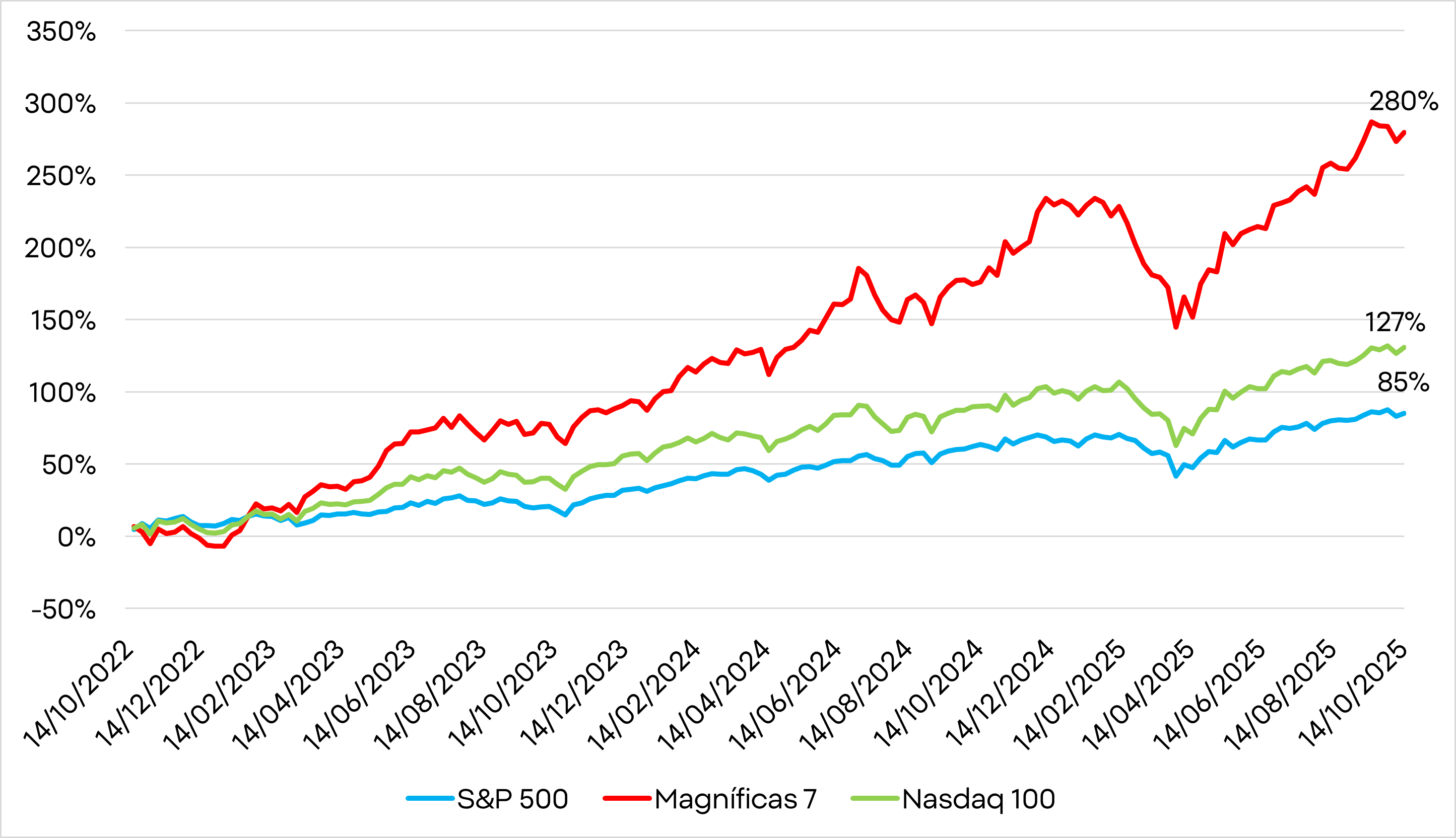 - La inteligencia artificial impulsa el mayor ciclo alcista desde 2022, con el S&P 500 subiendo un 85 % y las “Magníficas 7” un 280 %.