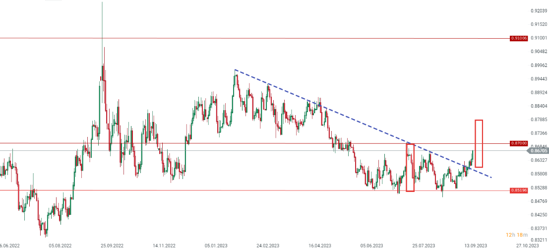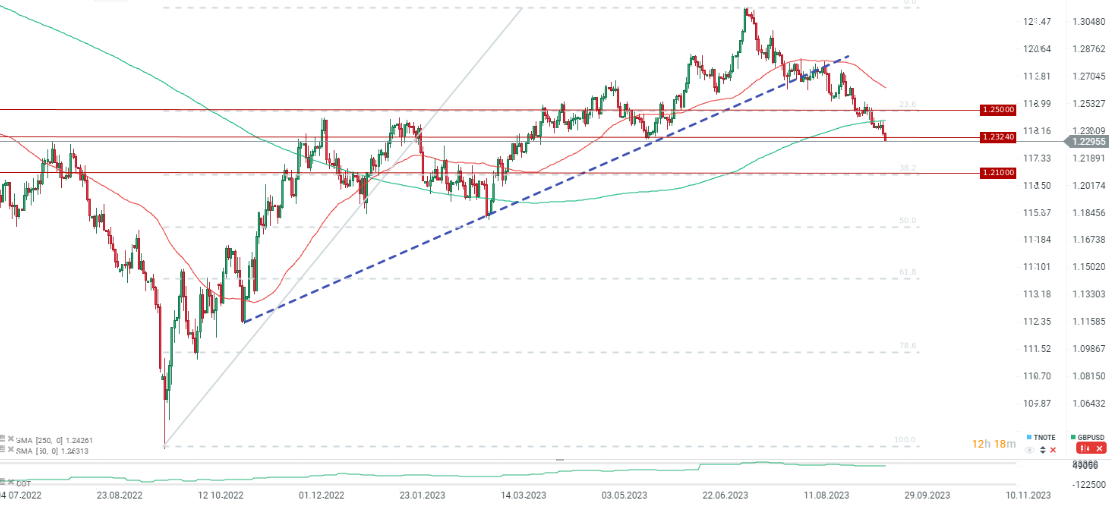 La inflación en el Reino Unido cayó en agosto al 6,7% interanual, y la inflación base o subyacente cayó hasta el 6,2% interanual. Curiosamente, aprendimos anteriormente sobre los datos salariales, donde la media de 3 meses mostró un crecimiento interanual de hasta el 8,5%, lo que teóricamente implicaría una creciente presión inflacionaria. Fuente: Bloomberg Finance LP, XTB