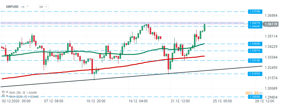 El par GBP/USD extendió su impulso alcista después de superar la resistencia principal en 1.3600 a niveles no vistos desde mayo de 2018 ante la creciente especulación de que el Reino Unido y la Unión Europea se están acercando al acuerdo comercial del Brexit. Actualmente el par se acerca a los máximos de este año en 1.3627. Si se produce una ruptura por encima, entonces podría lanzarse otro impulso alcista hacia la resistencia en 1.3724.