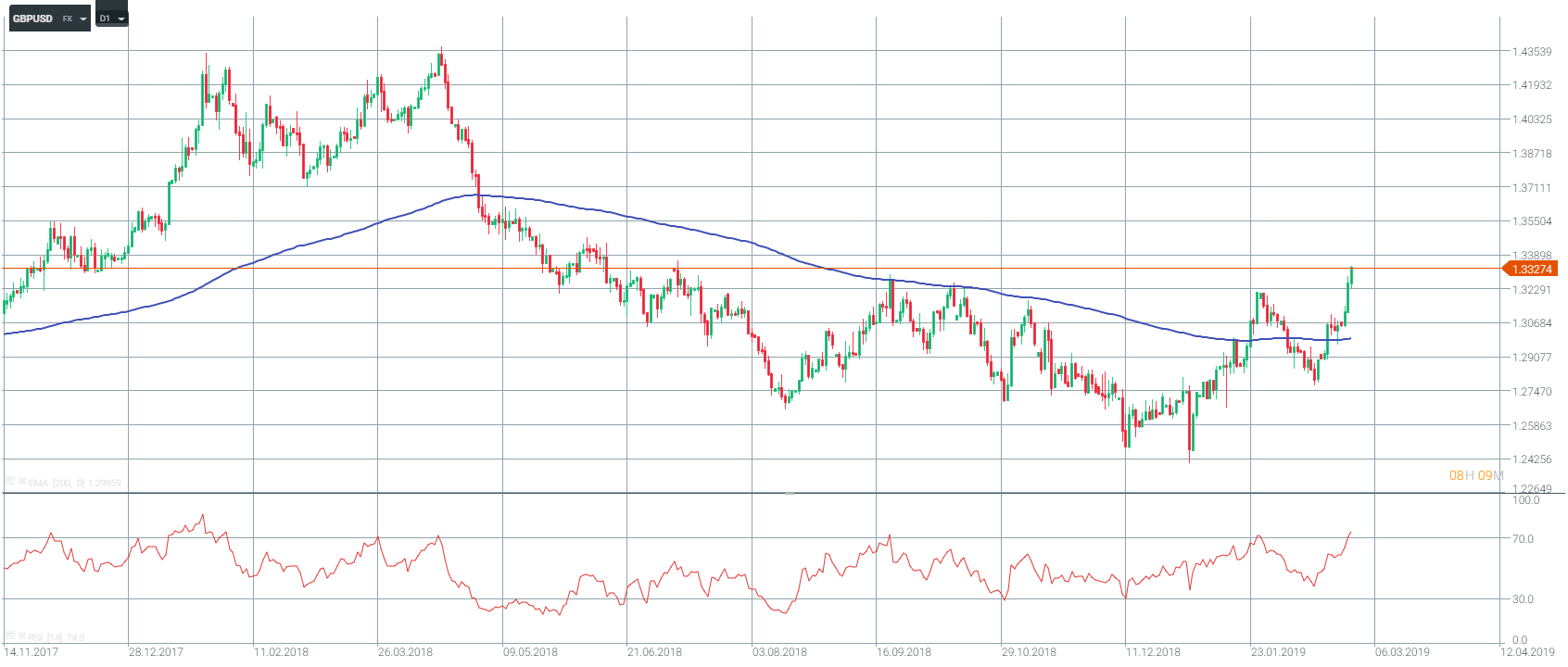 La libra esterlina es una vez más la más fuerte entre las principales divisas, ya que los inversores esperan que la fecha de Brexit se retrase con el tiempo. El gobierno del Reino Unido publicó un informe que dice que los controles fronterizos costarán a las empresas 13.000 millones de libras esterlinas al año y que las empresas no están preparadas para Brexit duro. La Primera Ministra, Theresa May, prometió al Parlamento una votación sobre la prórroga de las negociaciones si su acuerdo es rechazado de nuevo. El GBPUSD rompió la zona de resistencia en torno a 1,3250 y cotiza al nivel más alto desde julio.