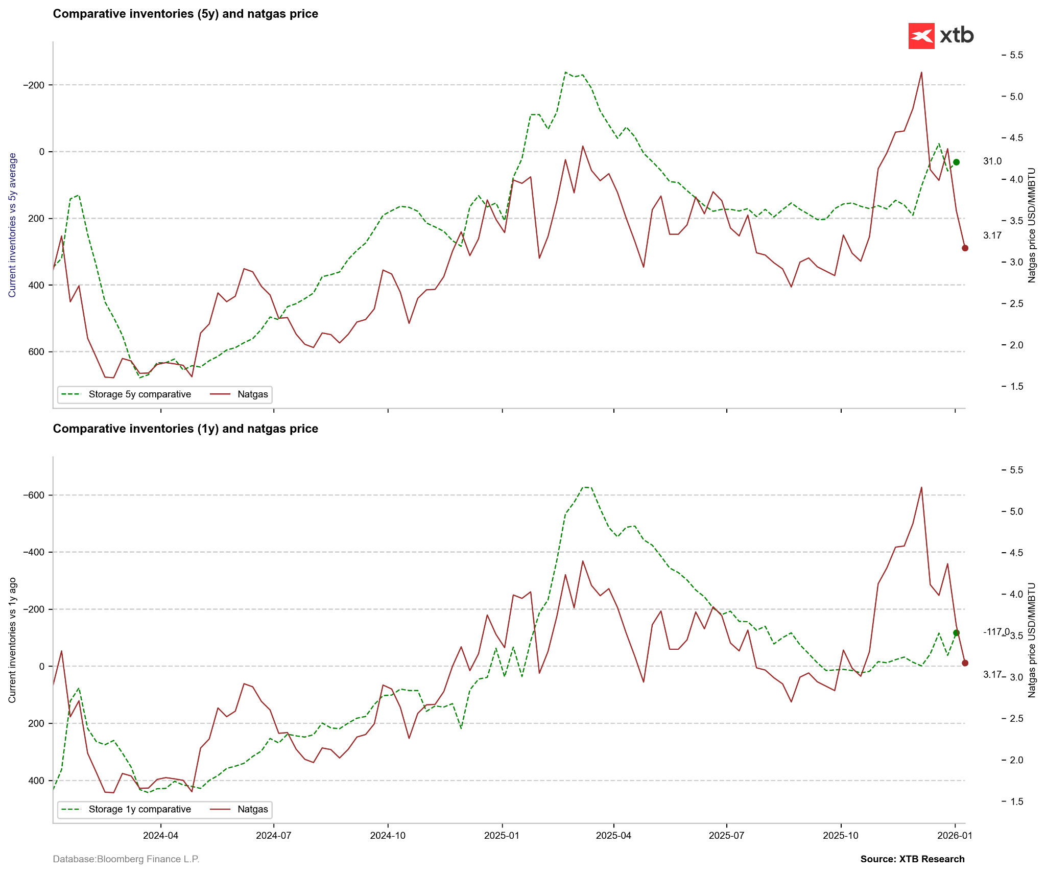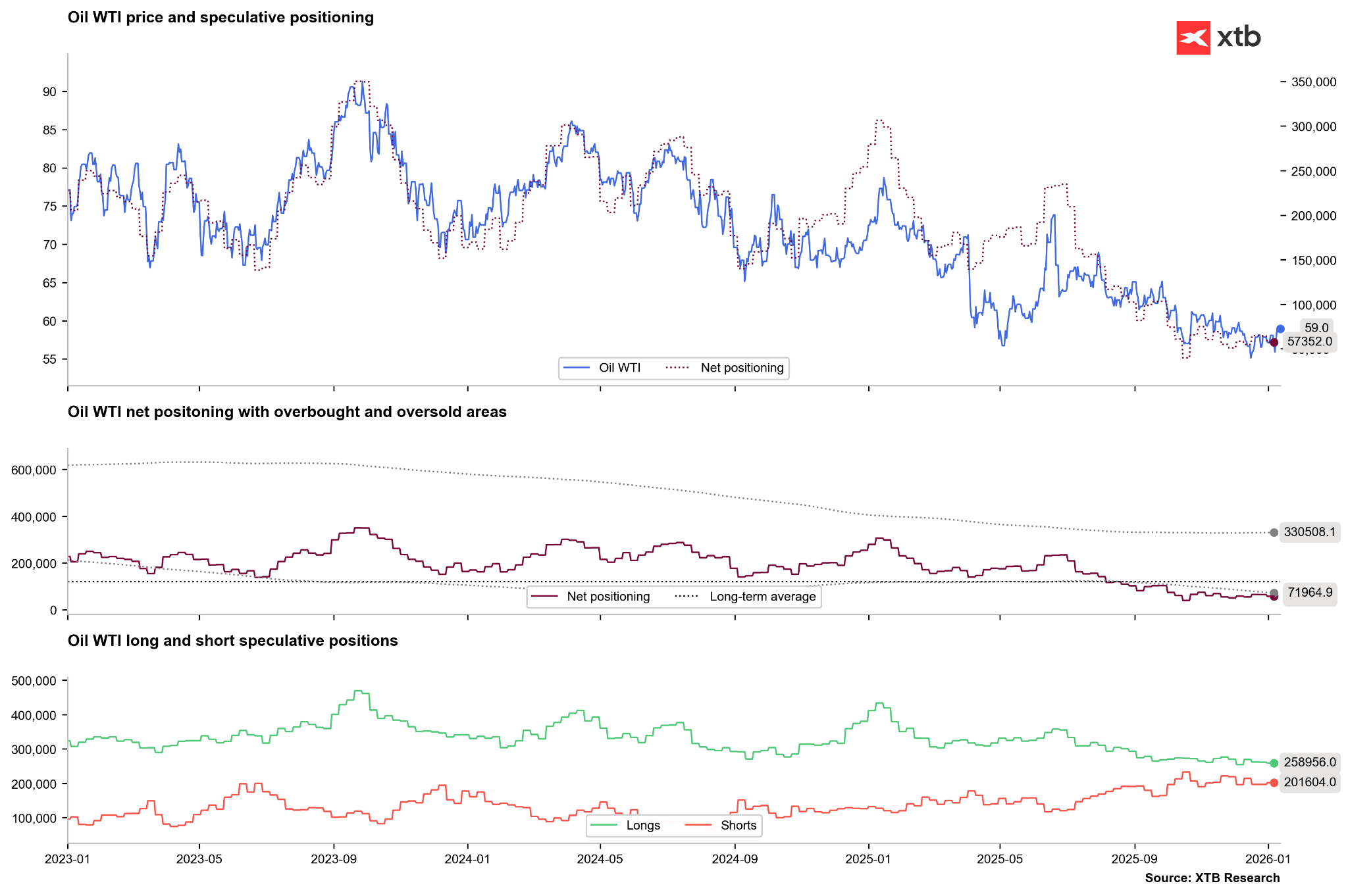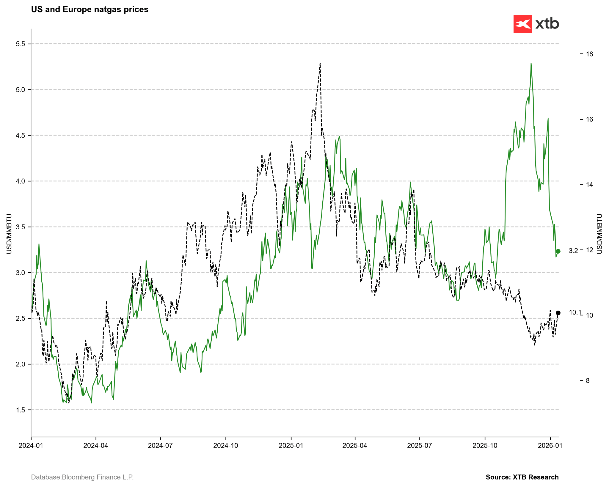 El posicionamiento especulativo en gas está cayendo drásticamente. El posicionamiento neto se acerca a niveles de sobreventa vistos por última vez a finales de 2024; en ese momento, sirvió como señal contraria, aunque coincidió con una disminución general del interés abierto. Actualmente, la situación se ha invertido, con posiciones especulativas tanto cortas como largas en aumento. Fuente: Bloomberg Finance LP, XTB