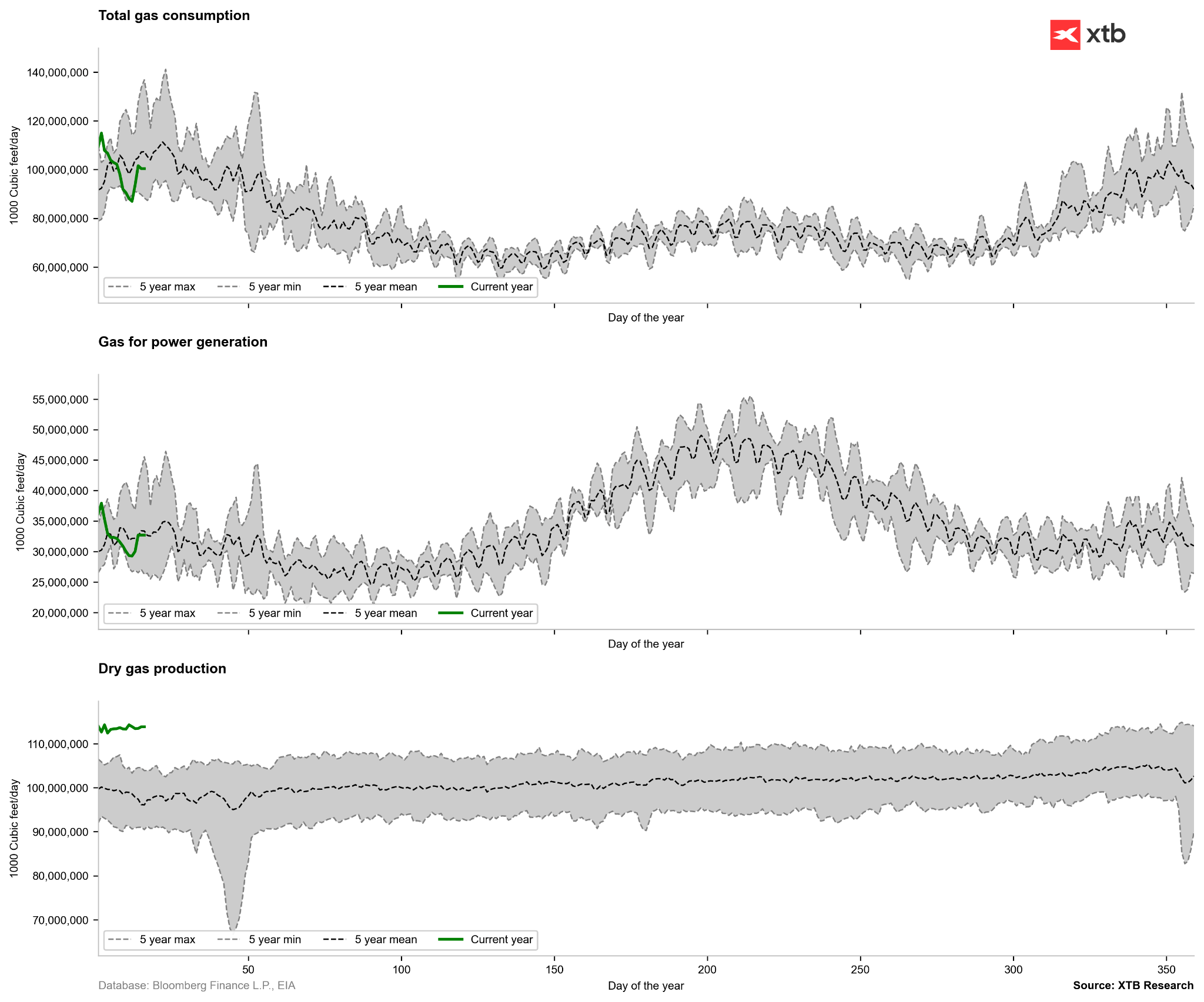 La demanda de gas se encuentra actualmente ligeramente por debajo del promedio de los últimos cinco años, pero un claro aumento en los grados-día de calefacción sugiere un repunte de la demanda para finales de enero. Fuente: Bloomberg Finance LP, XTB