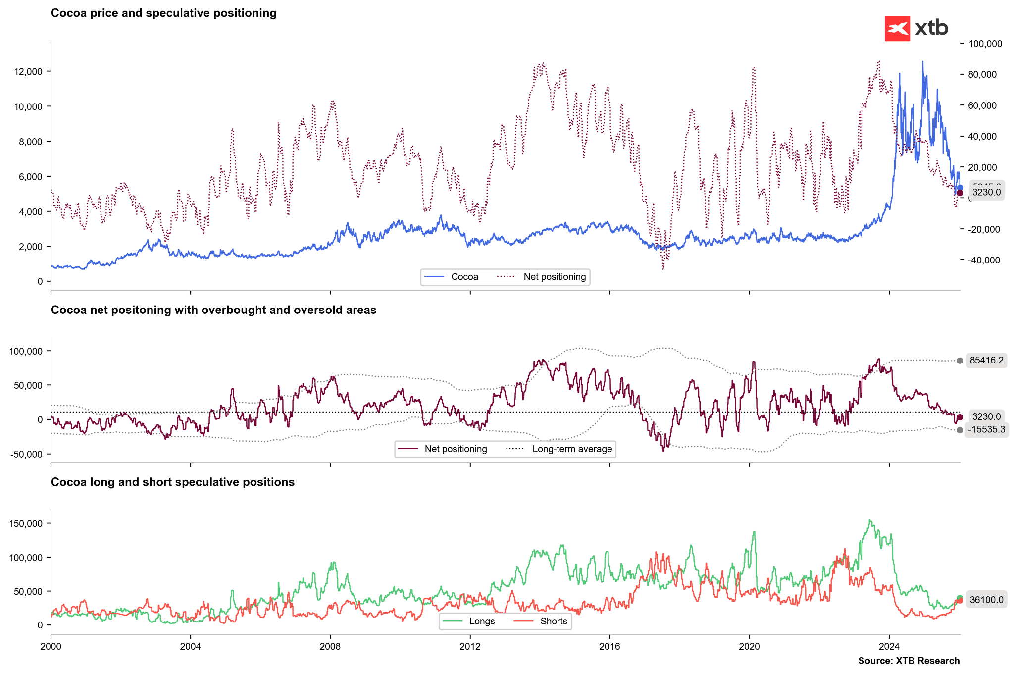Las posiciones especulativas largas y cortas en cacao han aumentado en los últimos meses, pero las posiciones cortas han crecido mucho más rápido. El cacao sigue estando extremadamente sobrevendido, especialmente en el mercado de futuros de Londres. Fuente: Bloomberg Finance LP, XTB