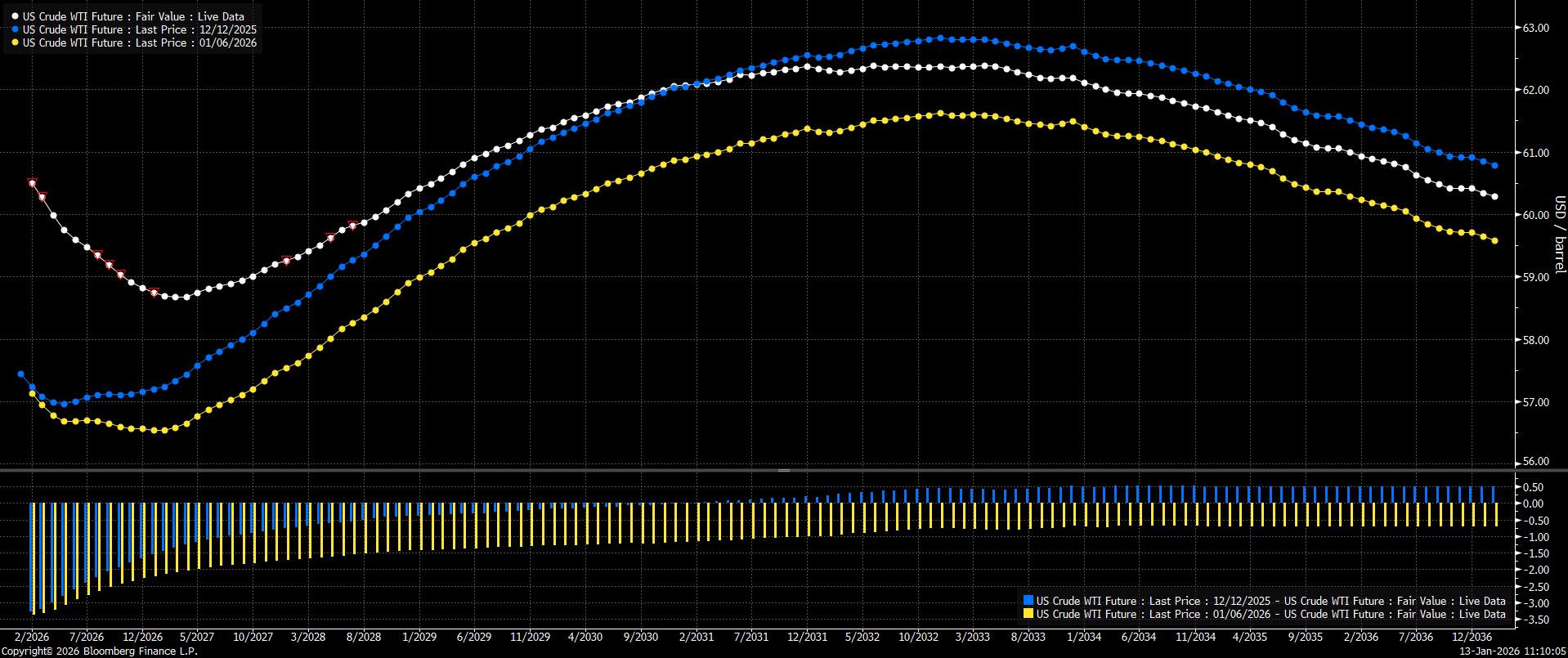 La curva forward ha regresado a la contracción hasta marzo de 2027, en comparación con la contracción mínima observada hace una semana y un mes. Dada la baja probabilidad de un déficit de mercado este año, se espera que los precios retrocedan en las próximas semanas, salvo una escalada geopolítica en Venezuela, Irán o Rusia. Sin embargo, si EE. UU. decide intervenir en Irán, los precios del WTI podrían encontrarse en un rango a corto plazo de entre 62 y 65 dólares por barril. Fuente: Bloomberg Finance LP