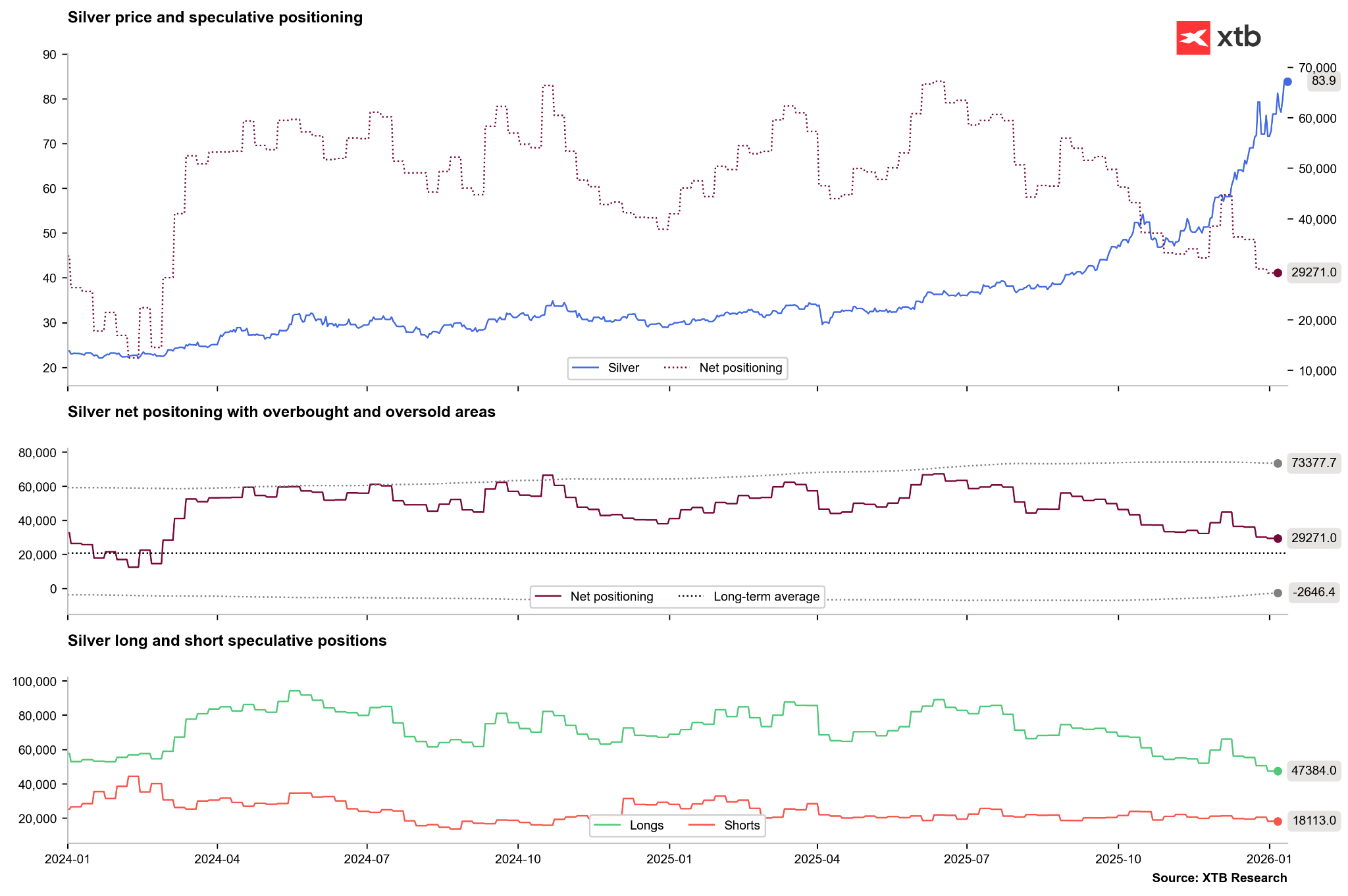 Las posiciones largas en plata se han reducido desde noviembre, lo que sugiere que los fondos indexados de materias primas o los proveedores de swaps concentraron sus posiciones al principio tras la publicación de las ponderaciones del índice a finales de 2025. Las posiciones netas se acercan ahora al promedio a largo plazo, lo que podría indicar un cambio de tendencia y una nueva afluencia de posiciones largas. Fuente: Bloomberg Finance LP, XTB