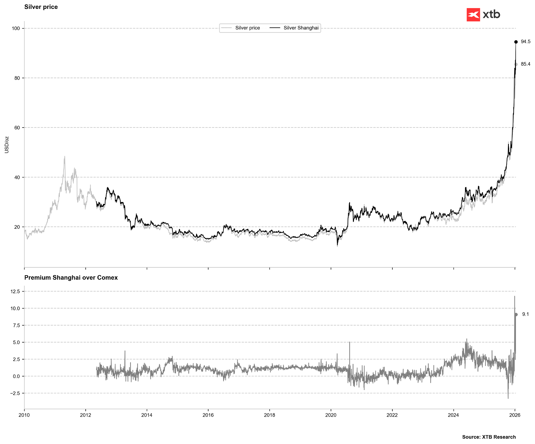 La prima de precio en la Bolsa de Oro de Shanghái está alcanzando niveles muy altos una vez más. Alcanzar los 100 $/oz en Shanghái podría ser un punto de inflexión a corto plazo para los especuladores. Fuente: Bloomberg Finance LP, XTB