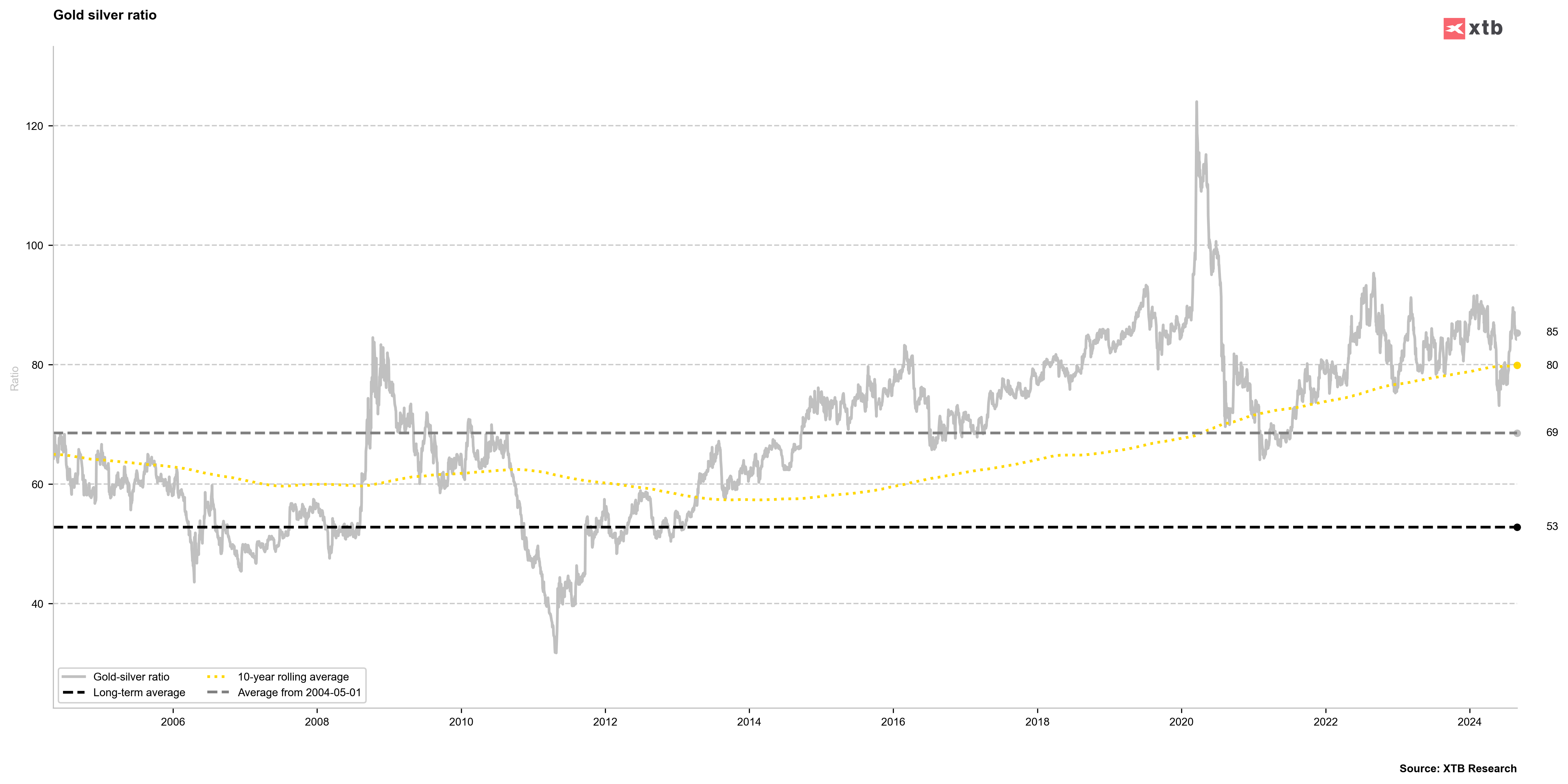 La relación oro-plata ha vuelto a retroceder desde el rango 88-90. Sin embargo, una relación tan alta sugiere que la plata está infravalorada en relación con el oro. Por otro lado, durante un mercado bajista en metales preciosos, la plata suele perder más valor que el oro, por lo que durante una corrección, no podemos descartar un retorno de la relación al rango 88-90. Sin embargo, este año hemos visto la relación alrededor del nivel 72-73. La media estática de 20 años indica un nivel de 69-70 como punto de equilibrio. Fuente: Bloomberg Finance LP, XTB