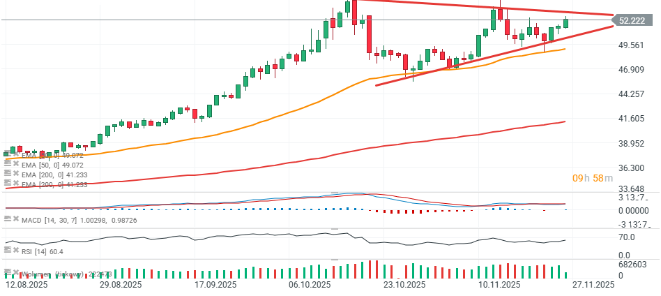 La plata ha estado subiendo recientemente, impulsada principalmente por las crecientes expectativas de un recorte de tipos por parte de la Reserva Federal en diciembre y la debilidad del dólar. El precio superó los 52 dólares por onza, recuperando las pérdidas tras caer por debajo de los 46 dólares en octubre. Al observar el RSI, podemos ver que, a pesar del sólido repunte, la lectura en torno a 60 no indica una euforia excesiva, lo que, junto con una perspectiva positiva del MACD, sugiere potencial para un mayor alza.