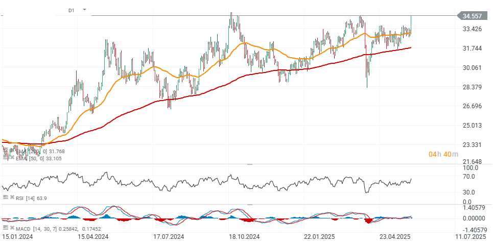 La principal zona de resistencia se sitúa ahora en los 35 USD, mientras que el soporte de largo plazo más relevante está en la zona de los 32 USD (media móvil exponencial de 200 periodos, línea roja), y en los 29–30 USD, respaldado por la acción del precio previa (mínimos locales de diciembre de 2024 y abril de 2025).