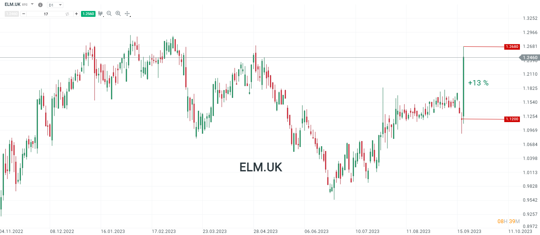 Elementis se ha disparado hasta un 13% en la sesión con la declaración del accionista de la compañía. A pesar de la desmentida de la cotizada, se mantienen las alzas en la sesión. Fuente: xStation