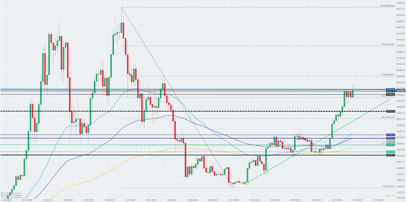 En el intervalo W1, bitcoin superó la estructura de 2023. Actualmente, el movimiento está siendo probado por el lado de los vendedores, y la criptomoneda ha vuelto a estar por debajo de la barrera de los $44,000. Fuente: xStation