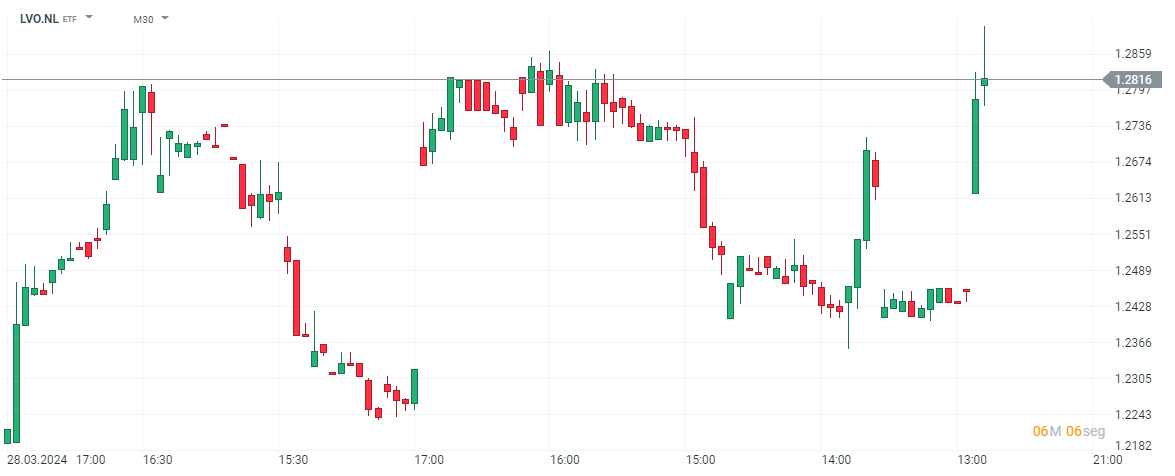 Una opción para beneficiarse de las subidas del VIX es el ETF que cotiza en nuestra plataforma, LVO.NL, que trata de replicar su movimiento. Sin embargo, hay que señalar que se trata de un ETF muy volátil, por lo que conviene entender su funcionamiento. Como puede observarse en el gráfico, el repunte es considerable.