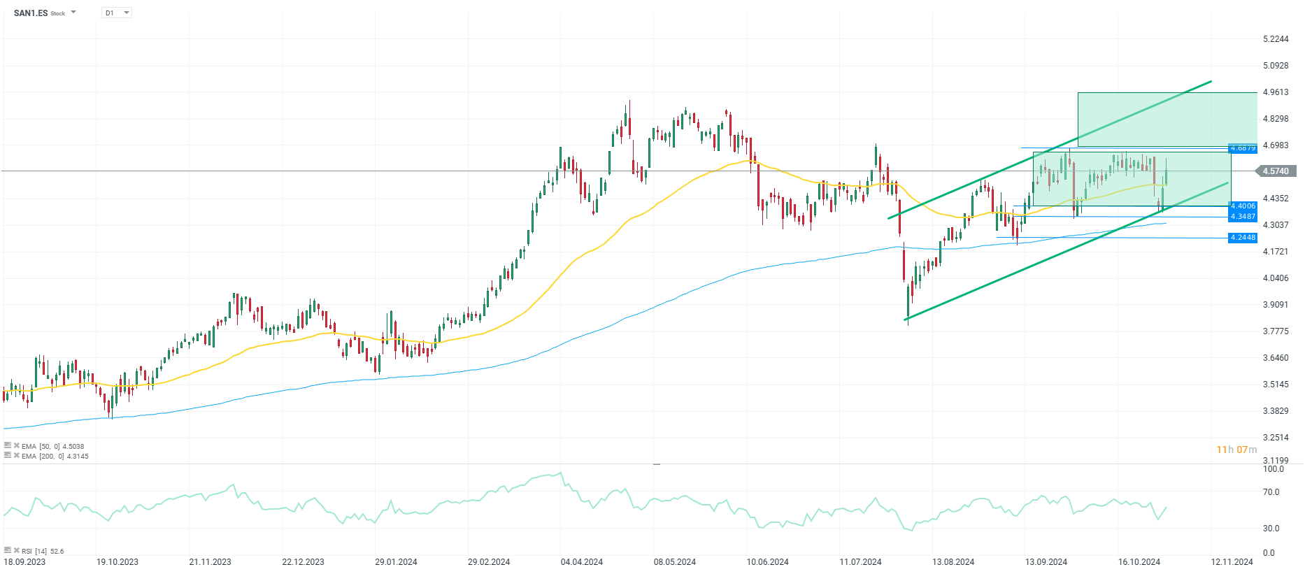 Desde principios de año las acciones del Banco Santander se han revalorizado un 19% gracias a la evolución de los tipos de interés y sus buenos resultados corporativos. Aunque en los últimos 5 días las acciones de la empresa estén corrigiendo, podemos observar en la gráfica un canal alcista de mínimos y máximos crecientes, que en estos momentos toca con la parte baja del canal, y que en caso de romper la resistencia de los 4,7 euros por acción, podría suponer un impulso en su cotización hasta los 5 euros.