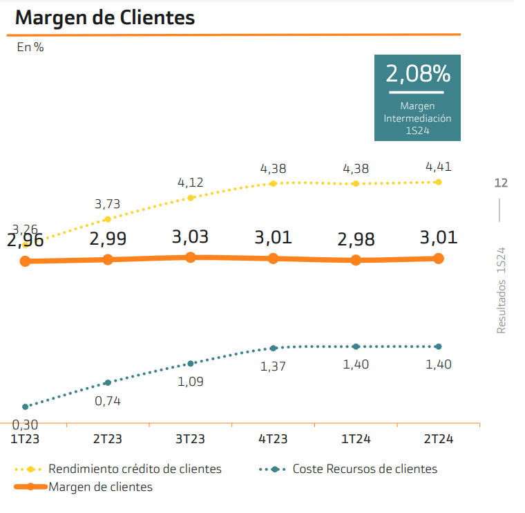 La evolución del margen de intereses está siendo positiva, ya que la entidad ha conseguido aumentar su rendimiento de clientes a la vez que ha contenido el coste de los recursos.